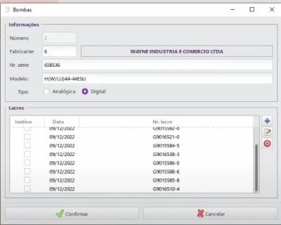 Conforme descrito no Survey deve-se agora cadastrar cada bomba disponível no posto com seus dados (série, lacre, etc). Exemplo de cadastro da bomba: