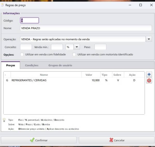 Permite cadastrar um preço especial de acordo com certas condições. É possível cadastrar preço a prazo (10%+) em cima do preço a vista para todas as formas de pagamento NOTA A PRAZO, segue exemplo: