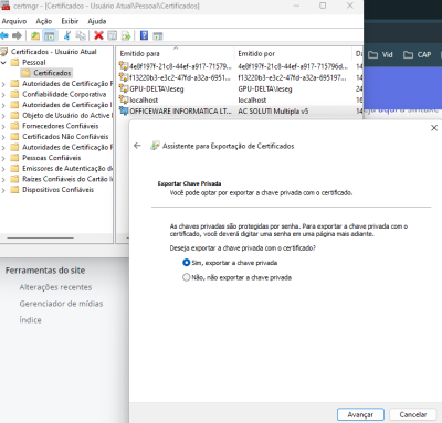- Para resolver o problema, você precisa usar o CERTMGR.MSC do Windows para re-exportar a Chave incluindo a chave privada, vide tela: