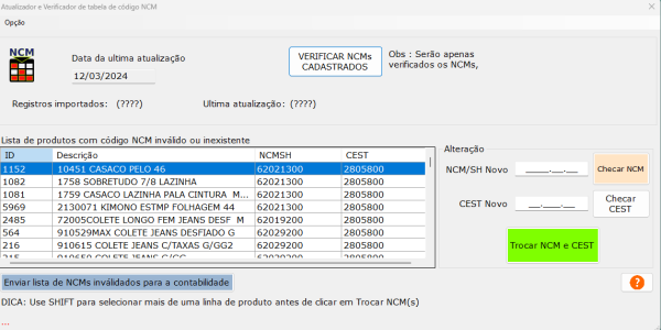 Clique no botão Trocar NCM para os produtos que serão identificados na grid como inválidos, selecione-o antes na grid usando as teclas SHIFT ou CTRL.