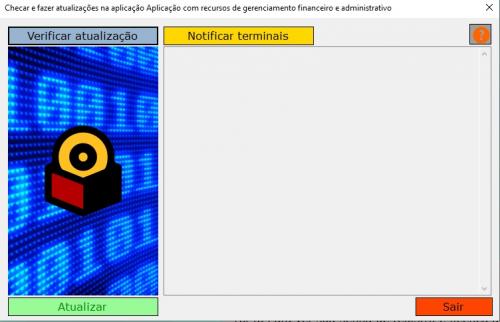Permite baixar e atualizar a aplicação com poucos cliques. Será efetivado um backup automático antes do procedimento. Esta janela não será aberta caso não exista atualização disponível.