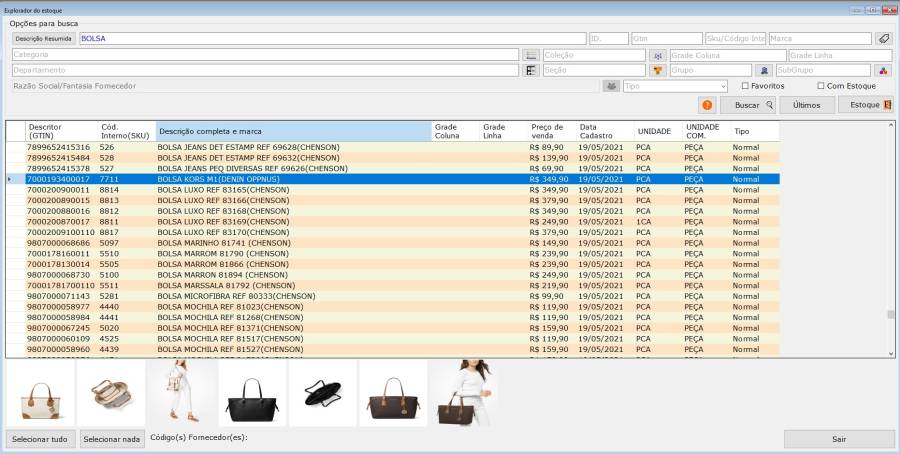 Ao selecionar um item que aparece na listagem de produtos após uma busca, será apresentado na parte inferior da janela todos os códigos de referência usados pelos fornecedores do produto. Também será disponibilizada uma opção para ver as imagens cadastradas do produto.