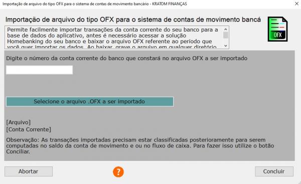 Através desta janela você vai poder importar arquivos do tipo .OFX que podem ser exportados pelo Home Banking do seu banco, tais lançamentos serão lançados automaticamente no Kratom Finanças. Depois de lançados, cada registro precisa ser conciliado, ou seja, precisa ser classificado financeiramente para que o saldo previsto da conta seja calculado automaticamente.