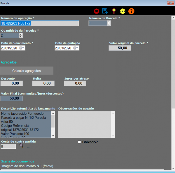Através desta seção você pode fazer o formulário calcular os valores agregados no pagamento da parcela, ou seja, se existir algum desconto no pagamento em dia, ou percentuais de multa ou juros por atraso. O botão Calcular Agregados fará estes cálculos automaticamente, facilitando assim a conferência por parte do operador.