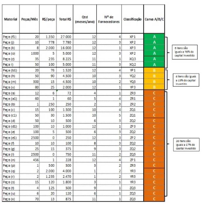 Estoque: Itens C – Os itens classificados como YR2, apesar de ter representatividade em capital empregado, não são aconselháveis investir em estoque devido a baixíssima frequência. Ou seja, somente comprar estes itens sob demanda. As peças do quadrante ZR2 (2 itens representam R$ 750) também podem comprados sob demanda devido a utilização menor que 5 meses em 12.