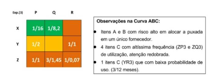 Estoque: Itens C – Os itens classificados como YR3, apesar de ter representatividade em capital empregado, não são aconselháveis investir em estoque devido a baixíssima frequência. Neste caso somente investiria em estoque se for uma demanda sazonal durante 3 meses ao ano, além de forma-lo próximo do evento.