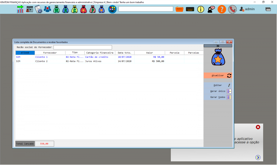 Nesta janela você terá relacionado todos os lançamentos favoritados na janela de lançamentos a receber. A partir desta janela você poderá editar tais lançamentos, regerar um ou todos os lançamentos de uma só vez como por exemplo fazer o lançamento do faturamento num novo mês de competência.