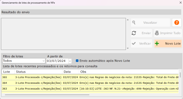 - Ao ter acesso à janela do Gerenciamento de Lote, desmarque a opção 'Envio automático após Novo Lote'.