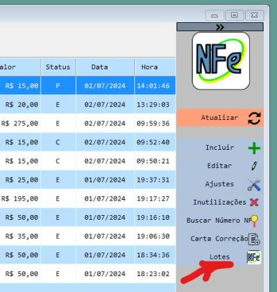- Quanto quiser enviar as notas fiscais de uma vez, clique em Enviar na própria janela de gerenciamento de lotes ou no ícone Lotes na janela de listagem de notas fiscais, vide: