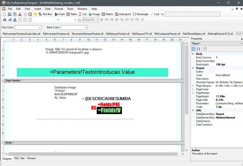 O Kratom lê o arquivo denominado FoldMailMarketing_modelo_1.rdl e anexa ao email durante o envio (se a opção de anexação estiver marcada). Antes de usar pela primeira vez o envio das ofertas, edite o arquivo referido usando o RdDesigner e faça algumas alterações: