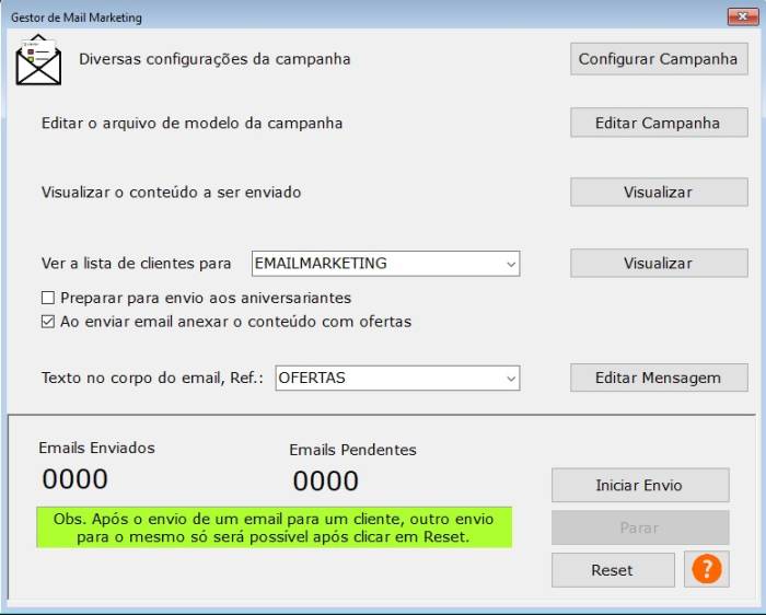 Este botão zera a lista de emails já enviados, permitindo que se re-envie os emails novamente para os clientes, clique somente quando Emails Pendentes tiverem sido zerados após o procedimento de envio.