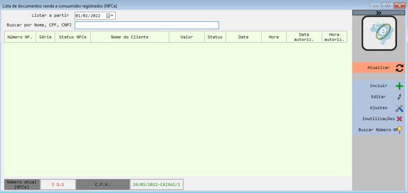 Esta janela permite gerenciar as notas fiscais eletrônicas ao consumidor (NFCe) emitidas ou não pelo aplicativo.