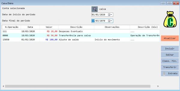 Esta opção permite rapidamente fazer uma transferência entre dois caixas diários, basta selecionar a conta destino e o valor e a função fará os lançamentos padronizados automaticamente. Obs: Não é possível fazer a transferência para outro tipo de conta.