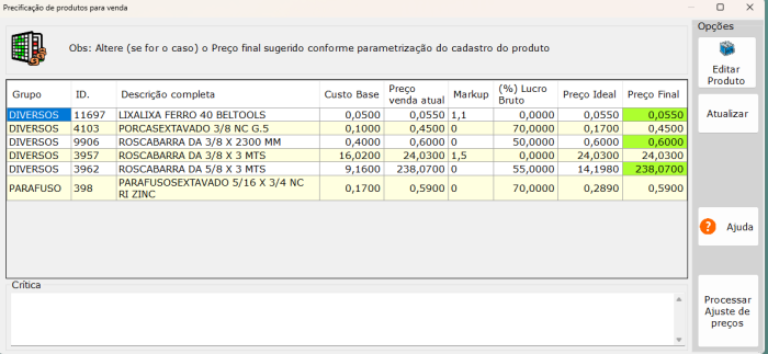 - Na parte inferior da janela existe uma área de crítica onde serão apresentados os erros de preenchimento dos parâmetros do precificador do produto.