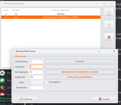 - Se cada PDV vai emitir sua nota fiscal, inclua uma nova série para cada PDV, preencha Conta PDV respectiva, Natop = 1, numeração =1.