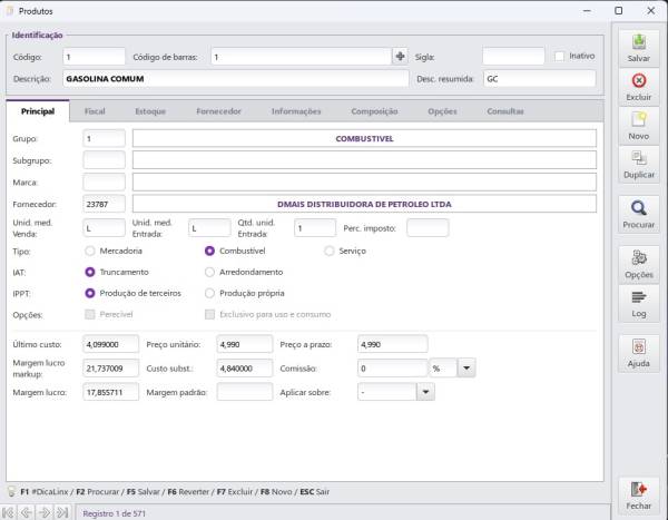 - Cadastrar todos os combustíveis de preferência nesta sequência de códigos em Cadastros/Produtos e associá-los ao fornecedor pré-cadastrado: