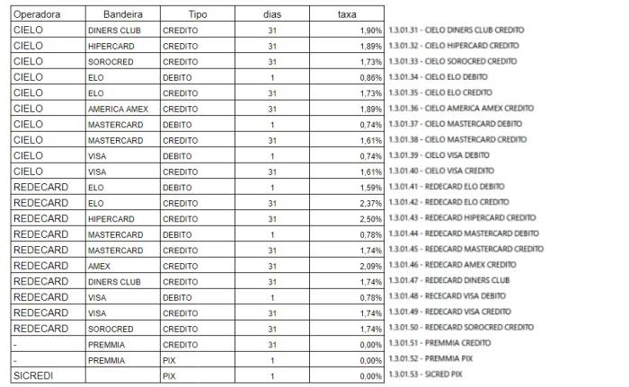 - Faça um levantamento no formato abaixo de todos os cartões, taxas e dias de reembolso, também cadastre para cada cartão um novo item no plano de contas da Conta Cartões. Vide um exemplo de levantamento: