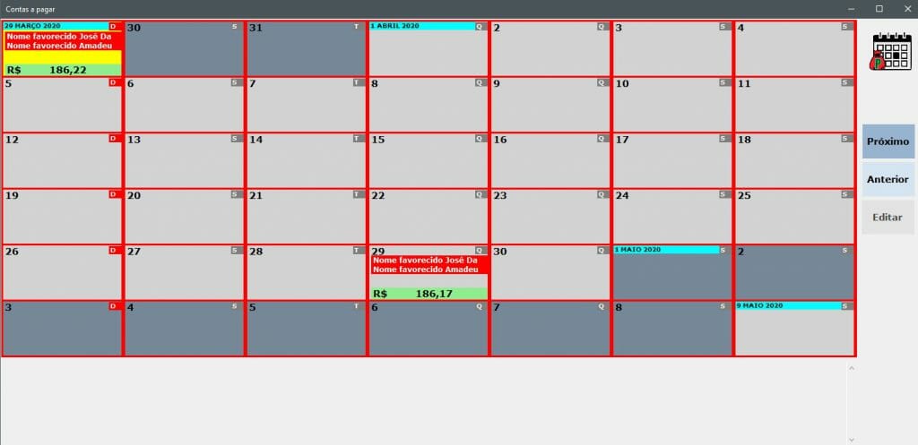 Esta janela é um calendário integrado com o contas a pagar permitindo rapidamente você ver quais dias e valores serão necessários para pagar. É possível paginar para frente e para trás bem como editar os lançamentos diretamente na janela do Contas a Pagar.